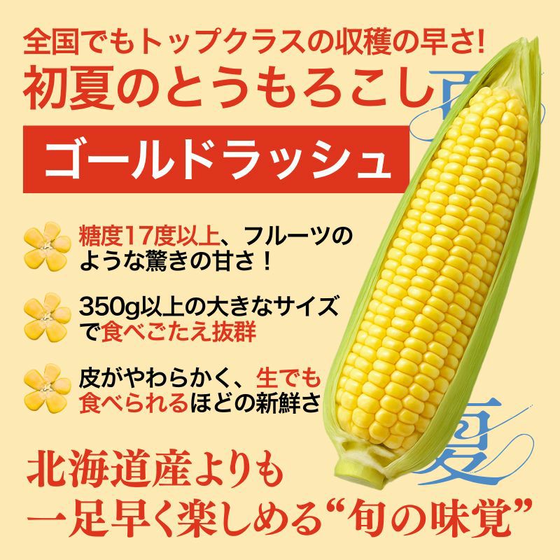 他の画像を見る 福岡県産 秋山さんちの極甘とうもろこし〈ゴールドラッシュ〉特大サイズ10本セット(1本350g以上) 送料込み 産地直送品 クール便(冷蔵) ¥ 3,980 税込 販売を終了しました。 詳細を見る お気に入りに登録する