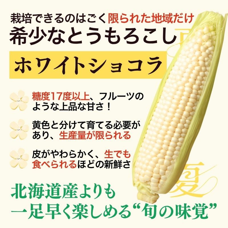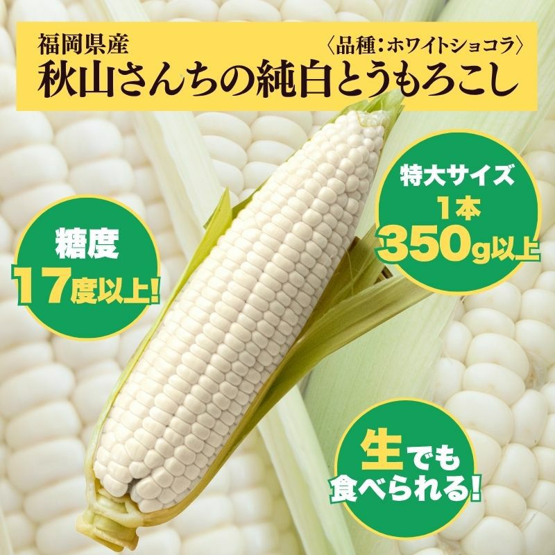 他の画像を見る 【限定100セット】福岡県産 秋山さんちの純白とうもろこし〈ホワイトショコラ〉特大サイズ10本セット(1本350g以上) 送料込み 産地直送品 クール便(冷蔵) ¥ 4,280 税込 販売を終了しました。 在庫切れ 詳細を見る お気に入りに登録する
