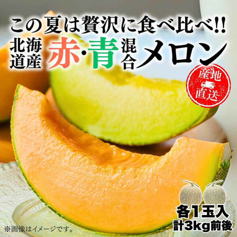 北海道産 赤肉・青肉混合メロンセット 各1玉計2玉 計3kg前後(常温)