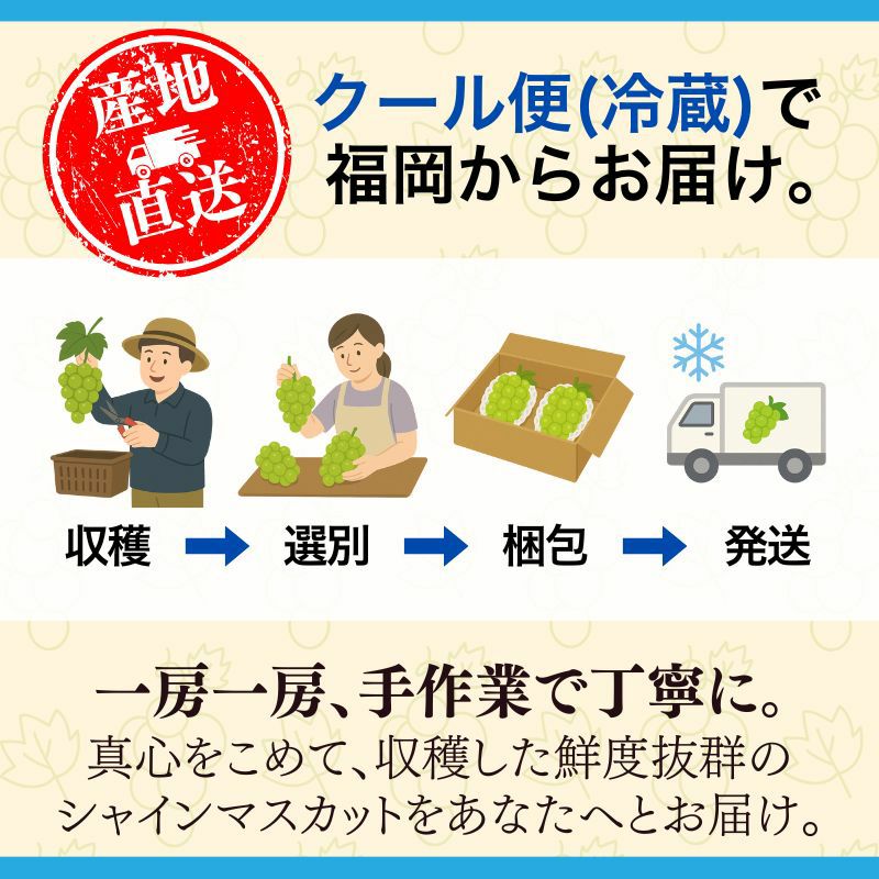 苺や柿など多彩な果物を育てる福岡県の温暖な気候と肥沃な土壌で育まれたシャインマスカット。収穫後すぐに冷蔵便で発送し、鮮度抜群の状態でお届け。美しい見た目と高級感で、大切な方への贈答品にも最適です。