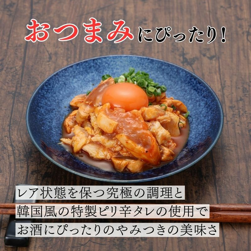 宮崎産JAS認定「妻地鶏」を使用したピリ辛韓国風ユッケ。特製タレがささみの柔らかい肉質を引き立てる逸品です。