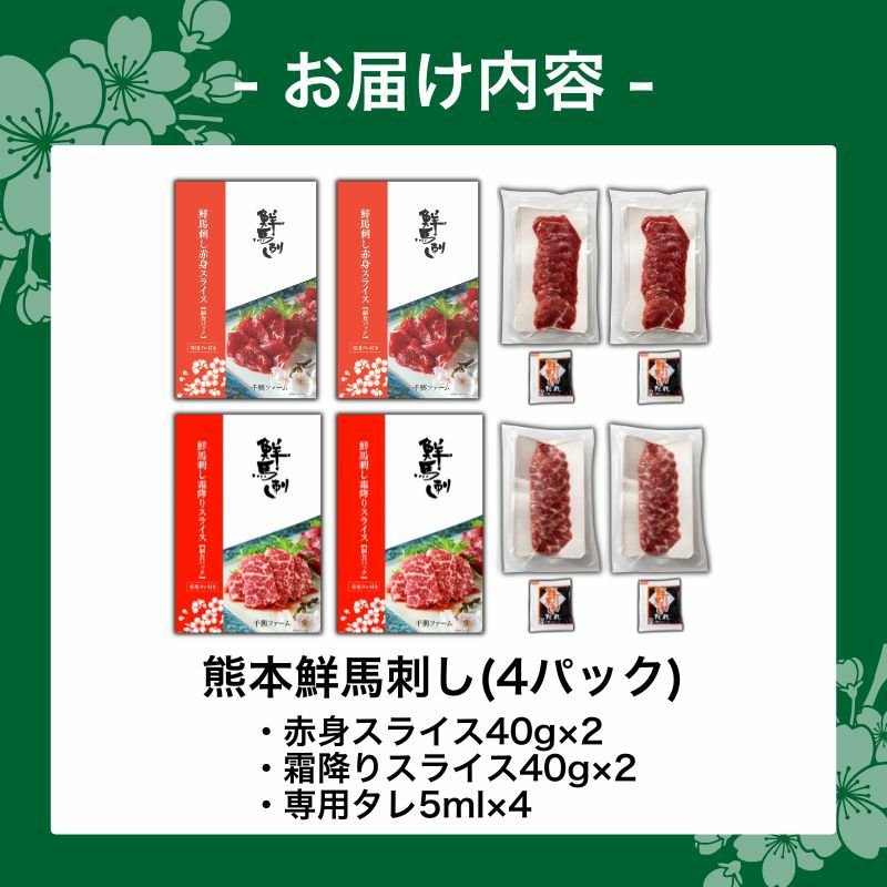 熊本鮮馬刺し スライス食べ比べ 4袋セット 計160g(赤身40g×2・霜降り40g×2)タレ付き