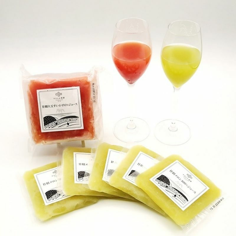 甘劇大玉すいか100%ジュースと、甘劇メロン100%ジュースを各4個セットに。果実ごとの個性を飲み比べで楽しめます。