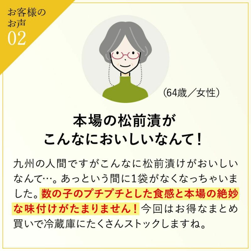 ロングセラーの人気商品! 数の子70%の贅沢松前漬をたっぷり4パックセットでお届け。ぷりぷり食感と濃厚な旨味を存分に堪能できます。