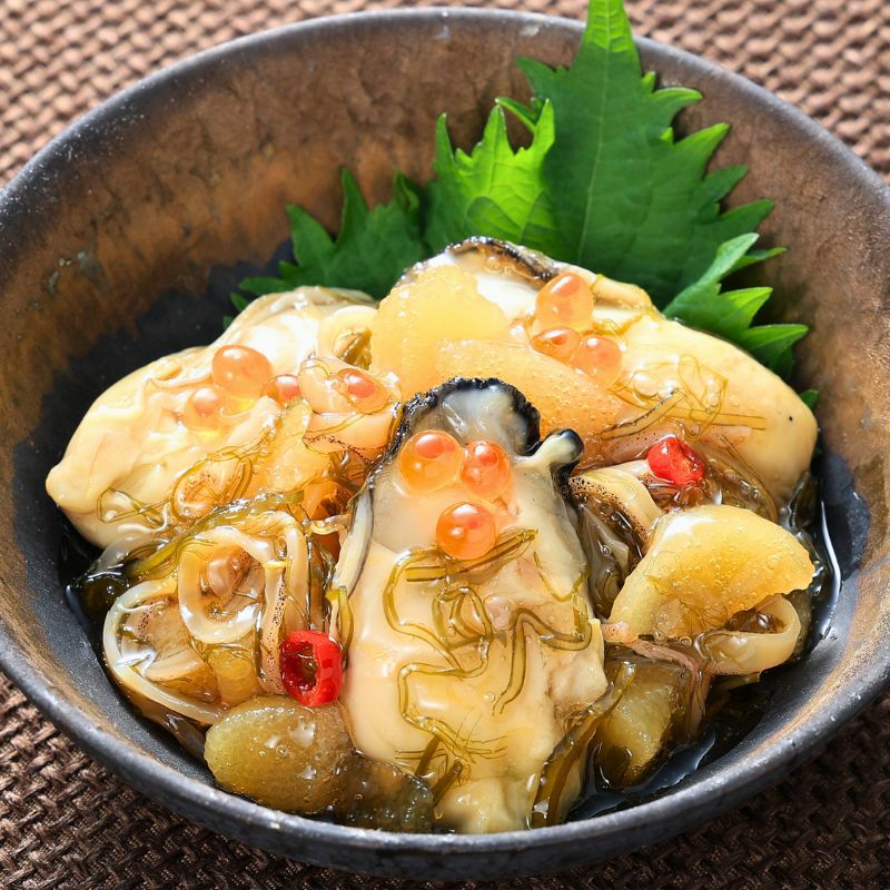 身の大きな牡蠣がごろっと3粒入り。ふっくらとした旨みととろけるような食感が、松前漬の奥深い味わいと絶妙にマッチします。