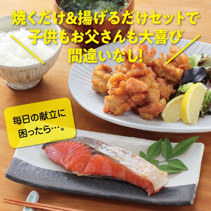 紅鮭は焼くだけ、ザンギは油で揚げるだけで簡単に調理可能。北海道グルメをおうちで手軽に楽しめる、贅沢な組み合わせです。