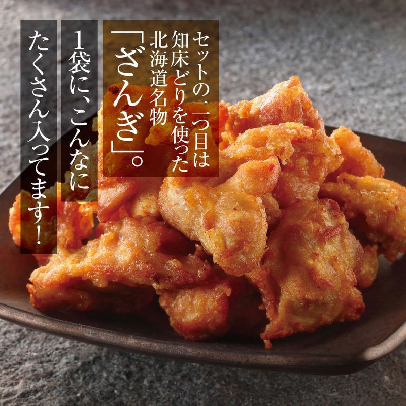 北海道の味覚を堪能! 脂乗り抜群の紅鮭と、知床どりを使った本格ザンギの豪華セット。ご飯のお供やおつまみにぴったりです。