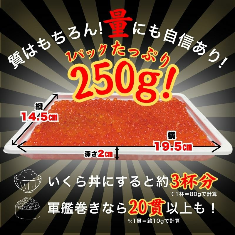 北海道産鮭いくらの醤油漬け。とろ~りとした食感は北海道産ならでは。濃厚なおいしさをお楽しみください。