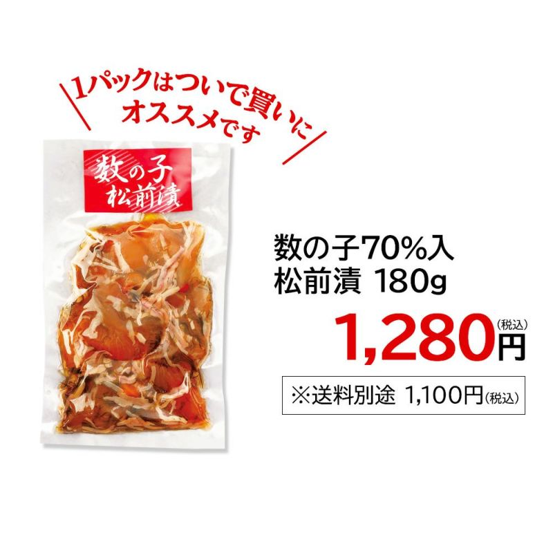 | 原材料名 | 数の子(オランダ産又はドイツ産)、砂糖、醤油、するめいか、昆布、米発酵調味料、鰹節エキス、唐辛子/調味料(アミノ酸等)、酒精、(一部に小麦、いか、大豆を含む) |