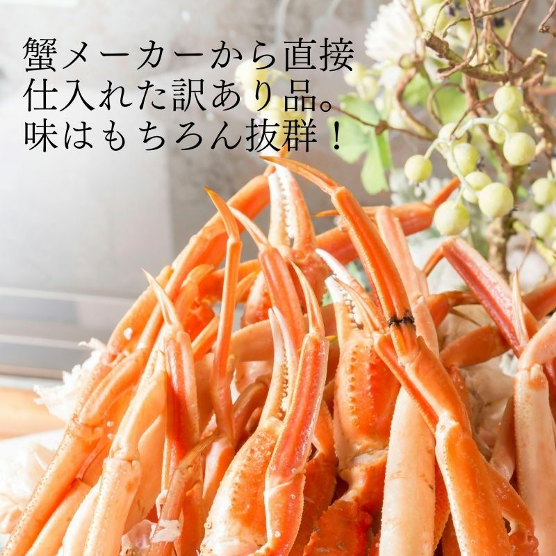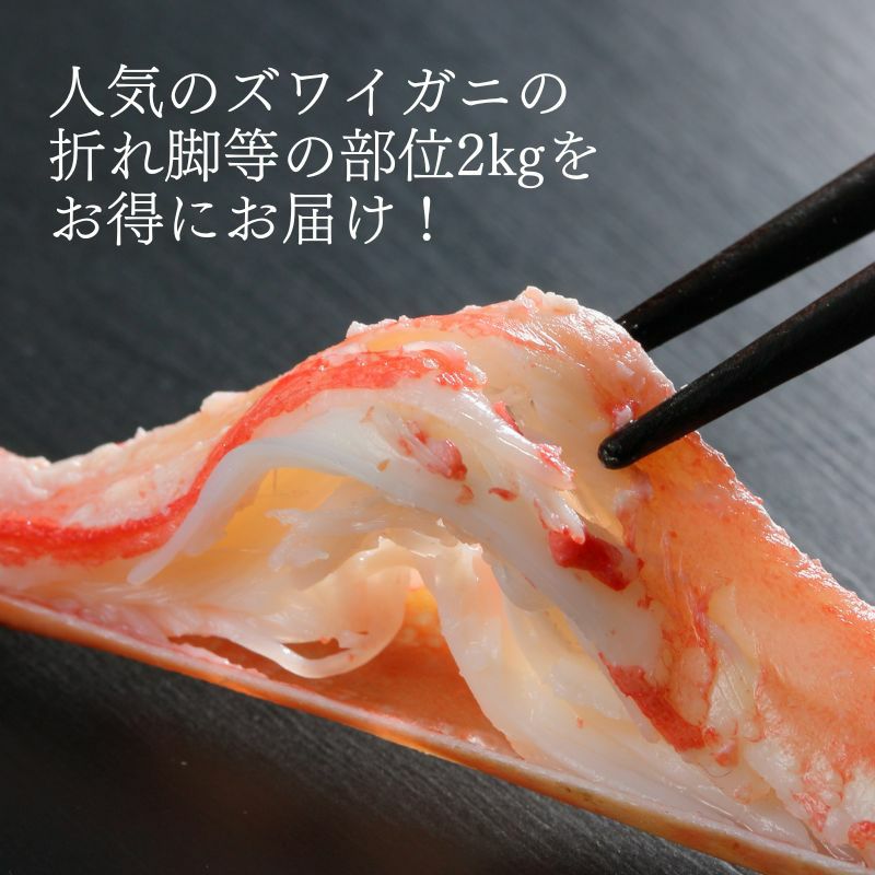 規格外部位を集めたたっぷり2kgのズワイガニ脚をお得にお届けします。当店では蟹メーカーから直接仕入を行い、折れ脚等の訳あり品を提供しますが、お味には問題ございません。
