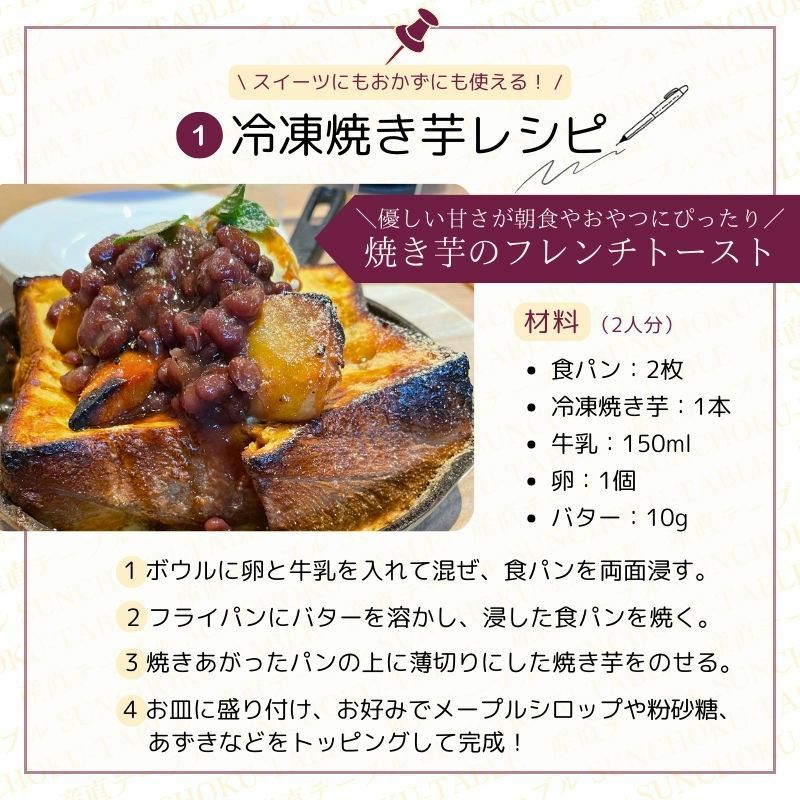 電子レンジで温めるだけで、まるで焼きたてのような甘く香ばしい味わいに。冷やして食べる「冷やし焼き芋」や、スイーツアレンジにもぴったりです。