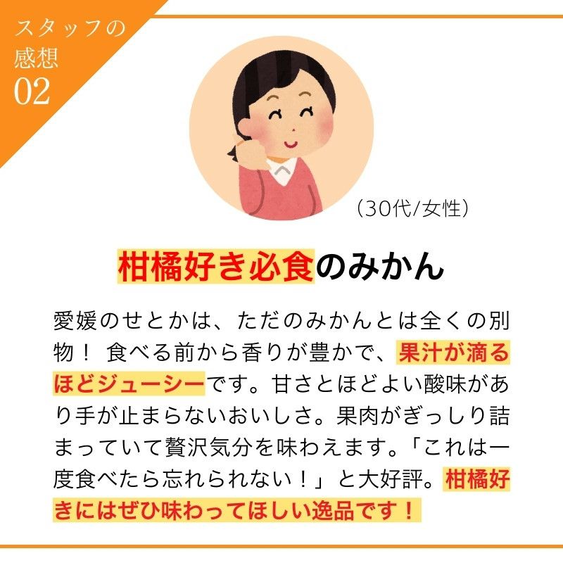 他の画像を見る 【まとめ買い割引】愛媛県産 せとか みかん 5kg 秀品 L~3Lサイズ(約16~27玉) 送料込み 産地直送品 常温 2セットで1000円OFF ¥ 7,280 税込 販売期間 2026/01/09 10:00 〜 2026/03/15 23:59 カートに入れる お気に入りに登録する