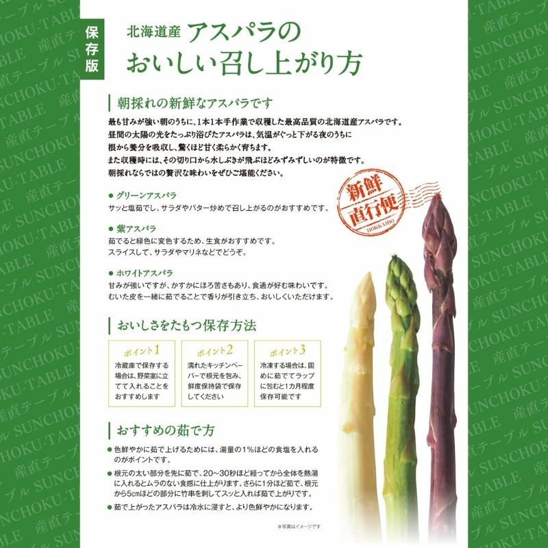 他の画像を見る 【まとめ買い割引】北海道産 朝摘み春アスパラ 〈家庭用訳あり〉 1kg(サイズ無選別/30~70本前後) 小松さんちのアスパラを中心に厳選! 送料込み 産地直送品 訳ありアスパラまとめ割 クール便(冷蔵) ¥ 3,980 税込 販売期間 2026/02/13 10:00 〜 2026/05/24 23:59 カートに入れる お気に入りに登録する